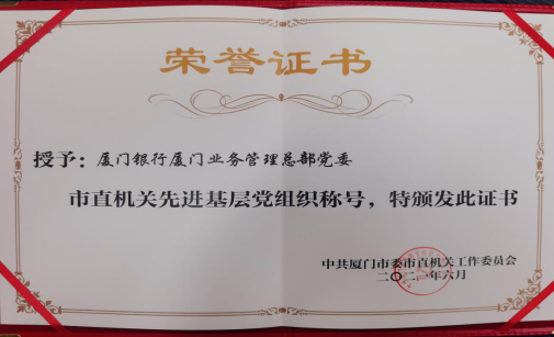 近日,中共厦门银行厦门业务管理总部委员会被中共厦门市委市直机关工作委员会授予“厦门市直机关先进基层党组织称号”。