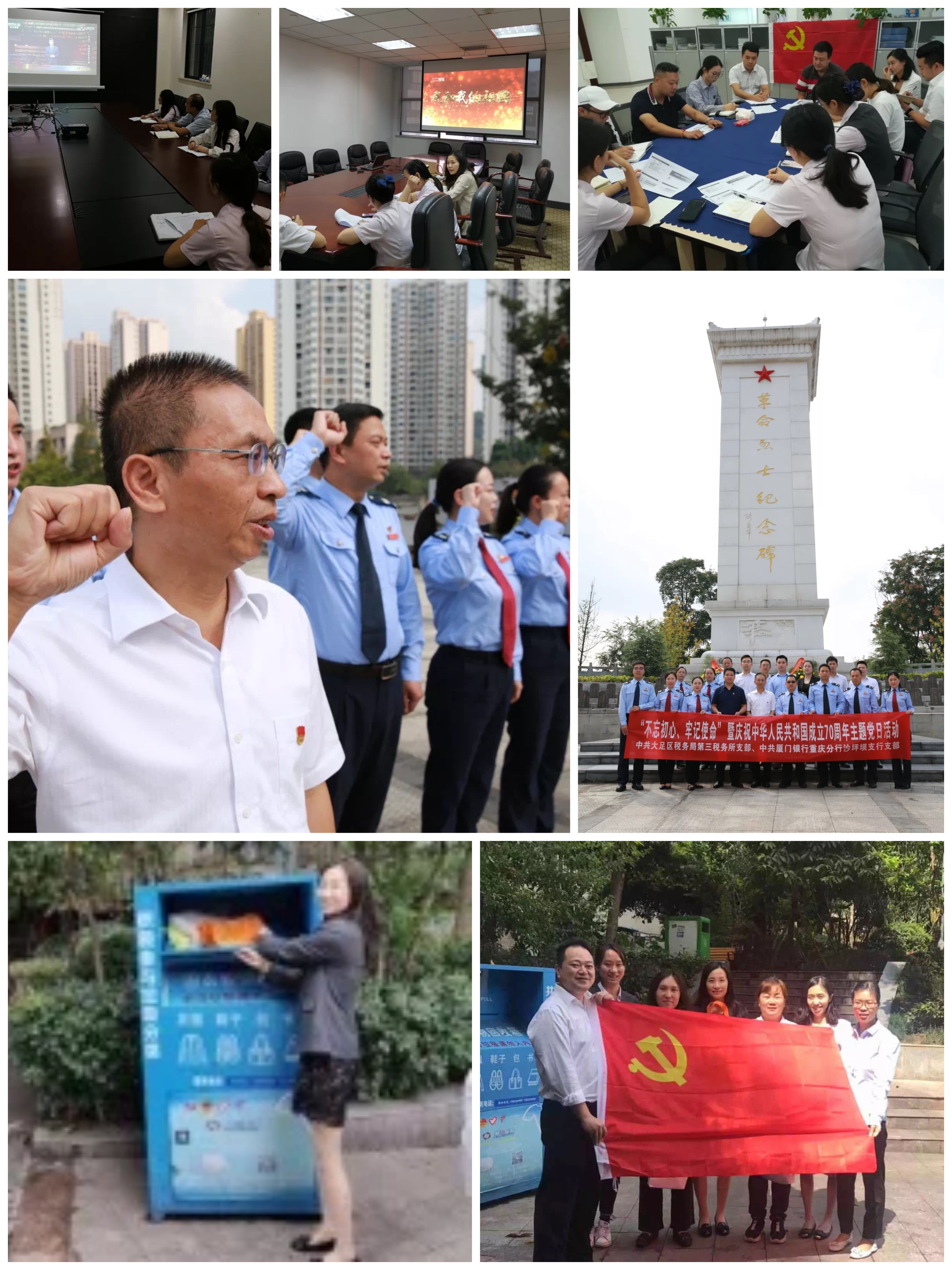 期间,分行第一支部党员积极发动身边同事,组织开展了捐赠旧衣活动,为市区困难群体献爱心、送温暖。沙坪坝支部走进周边社区拾捡垃圾、美化环境,传递环保理念,并密切联系当地税务机关党组织开展庆国庆暨主题教育党日活动,参观了烈士陵园并举行了座谈会,以对初心的守护缅怀革命英烈。第三支部及两江支部分别开展了国庆观影活动,组织观看了“国家记忆”栏目、《红色故事》系列短片温习历史,回顾新中国伟大成就。南岸支部开展了重温入党誓言主题党日活动,激励党员以誓言为镜,审视自身,强化责任担当。其他支部亦开展了爱国主题座谈会、集体观看阅兵式、齐唱《我和我的祖国》等活动抒发爱国情怀,献礼祖国华诞。
