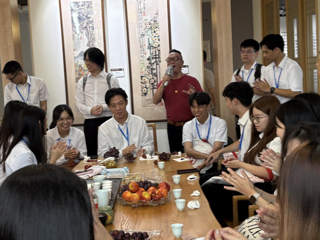 在福建省开明画院院长沈斗平、福州市开明画院院长邓春晖、书法家温泉的引导下,台湾青年学子细致观摩了国画大家沈锡纯先生的经典作品,感受其“泼墨写意、形神兼备”的艺术风格。沈斗平院长现场讲解沈锡纯的艺术生涯与创作理念,让台湾青年学子深刻体会到中华传统书画的独特魅力。