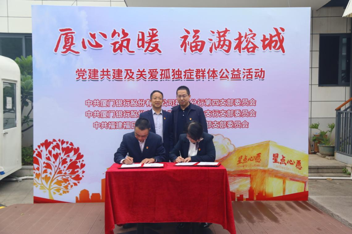 11月11日,中共厦门银行福州分行第四支部委员会、福州仓山支行支部委员会与中共福建福日电子股份有限公司本部支部委员会,共同走进福州市鼓楼区“星点心愿”公益店,开展“厦心筑暖 福满榕城”党建共建暨关爱孤独症群体公益活动。福州分行党委委员、副行长郑成辉与福日电子党委书记共同见证签约仪式。