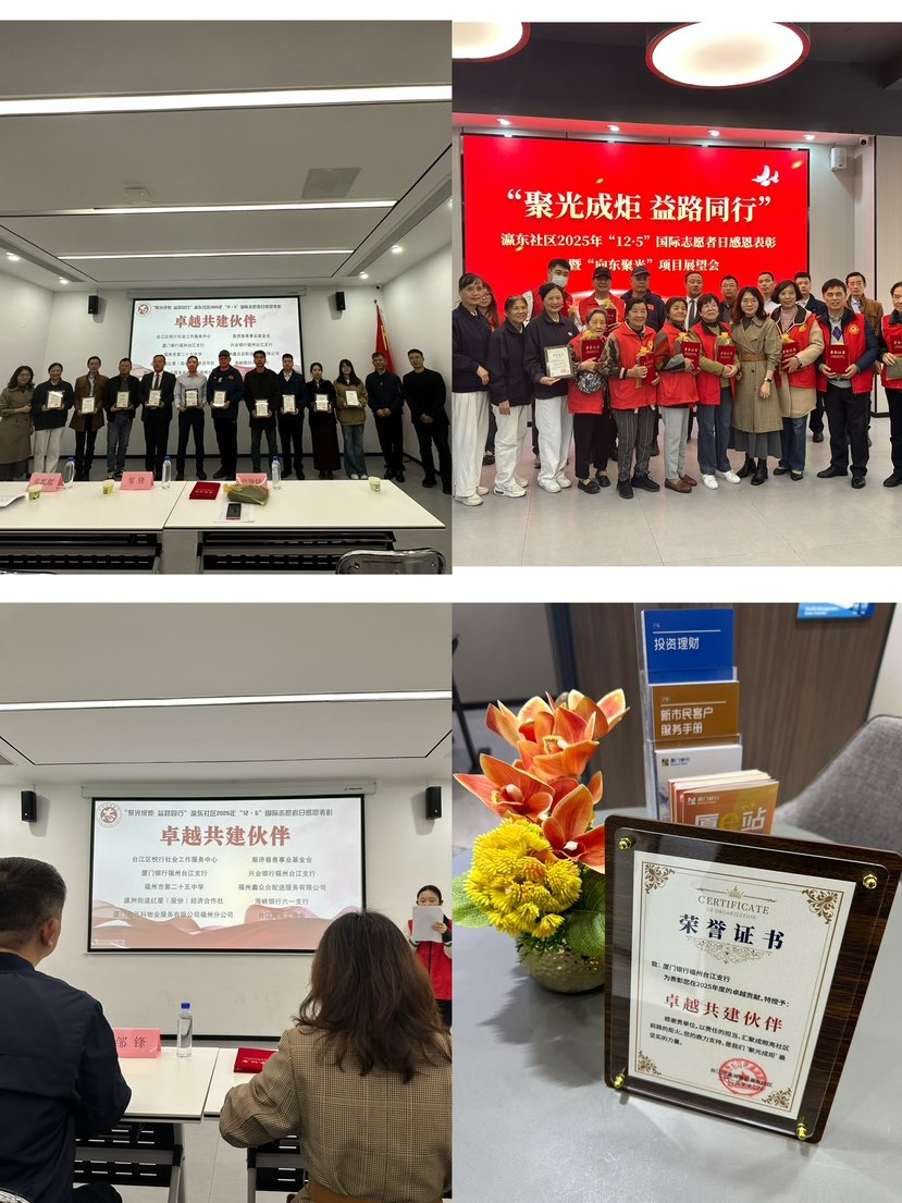 2025 年 12 月 3 日,瀛东社区志愿者表彰大会顺利举行,福州台江支行凭借长期深耕社区共建的扎实成效,再次获评 “卓越共建伙伴” 称号。这是该行自 2022 年入驻社区、建立共建关系以来,连续第三个年度获此殊荣,是社区对支行践行社会责任、贴心服务群众的高度认可。