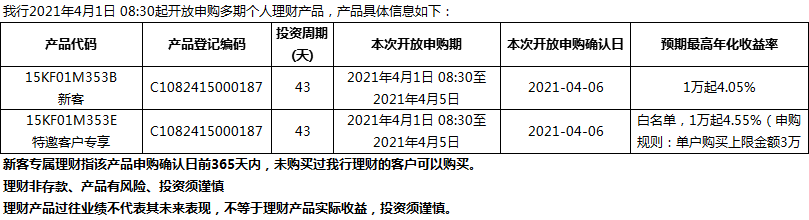 “凤凰花”预期型理财产品2021年4月1日发售信息