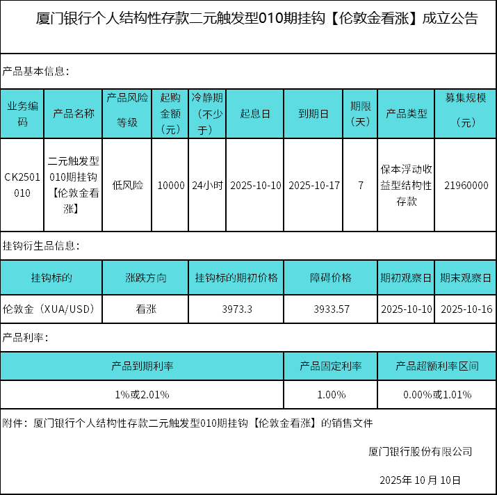 厦门银行个人结构性存款二元触发型010期挂钩【伦敦金看涨】成立公告 日期:2025-10-10 17:31:28 厦门银行个人结构性存款二元触发型010期挂钩【伦敦金看涨】销售文件.zip 返回 下一篇