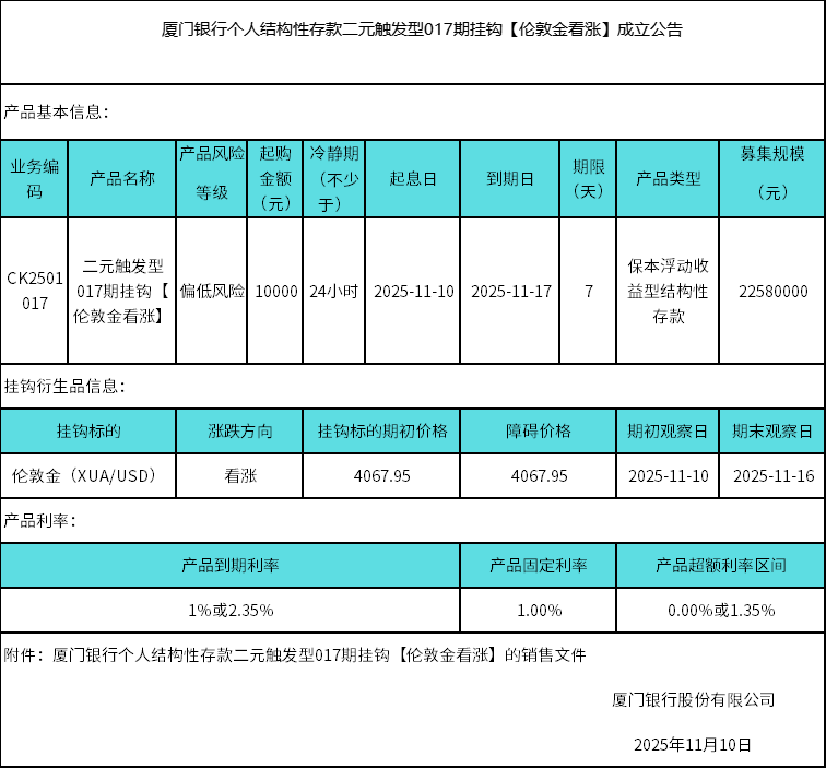 厦门银行个人结构性存款二元触发型017期挂钩【伦敦金看涨】成立公告 日期:2025-11-10 14:17:31 厦门银行个人结构性存款二元触发型017期挂钩【伦敦金看涨】销售文件.zip 上一篇 返回 下一篇