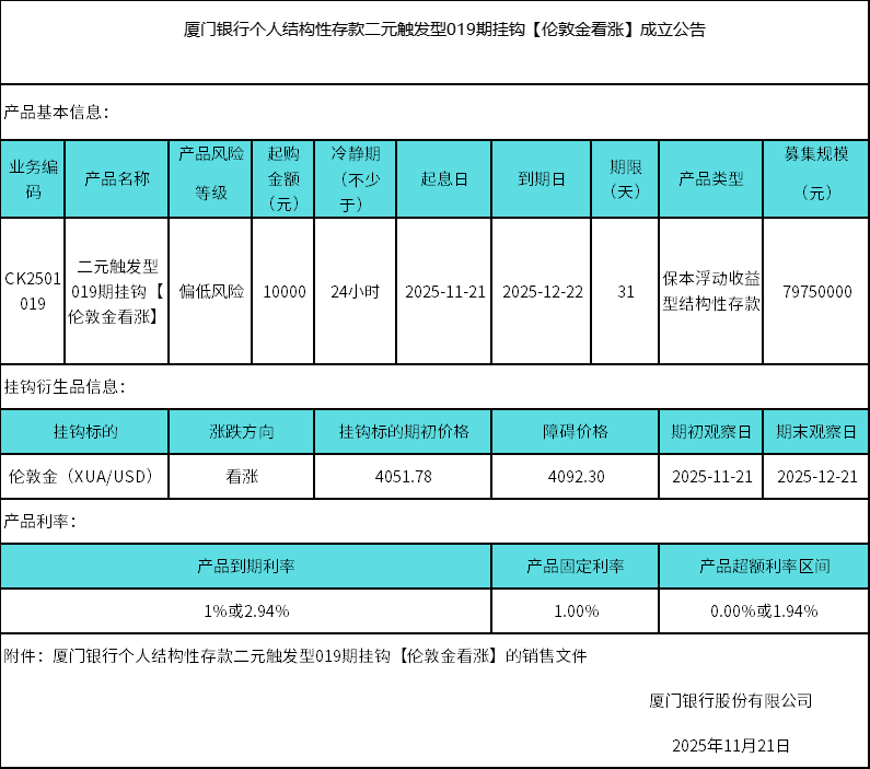 厦门银行个人结构性存款二元触发型019期挂钩【伦敦金看涨】成立公告 日期:2025-11-21 14:39:40 厦门银行个人结构性存款二元触发型019期挂钩【伦敦金看涨】销售文件.zip 上一篇 返回 下一篇