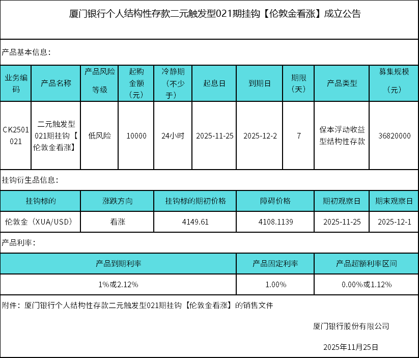 厦门银行个人结构性存款二元触发型021期挂钩【伦敦金看涨】成立公告 日期:2025-11-25 20:27:49 厦门银行个人结构性存款二元触发型021期挂钩【伦敦金看涨】销售文件.zip 返回 下一篇