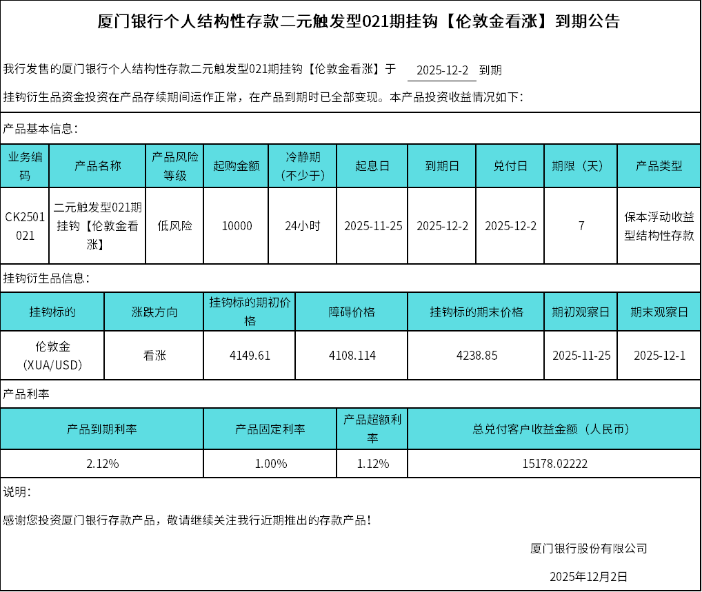 厦门银行个人结构性存款二元触发型021期挂钩【伦敦金看涨】到期公告
