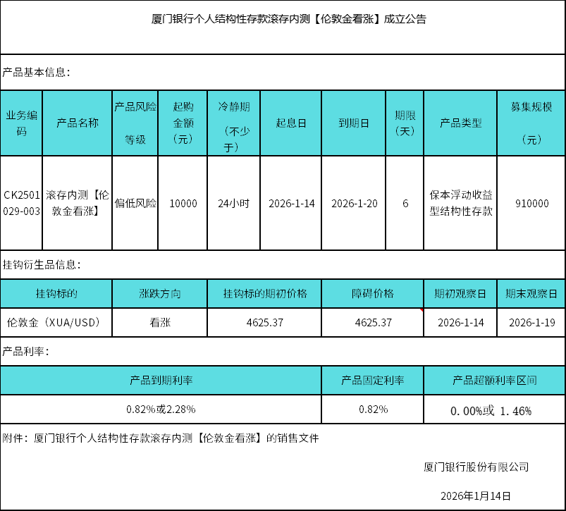 厦门银行个人结构性存款滚存内测【伦敦金看涨】到期公告 日期:2026-01-14 16:08:50 厦门银行个人结构性存款二元触发型029-003期挂钩【伦敦金看涨】销售文件.zip 上一篇 返回 下一篇