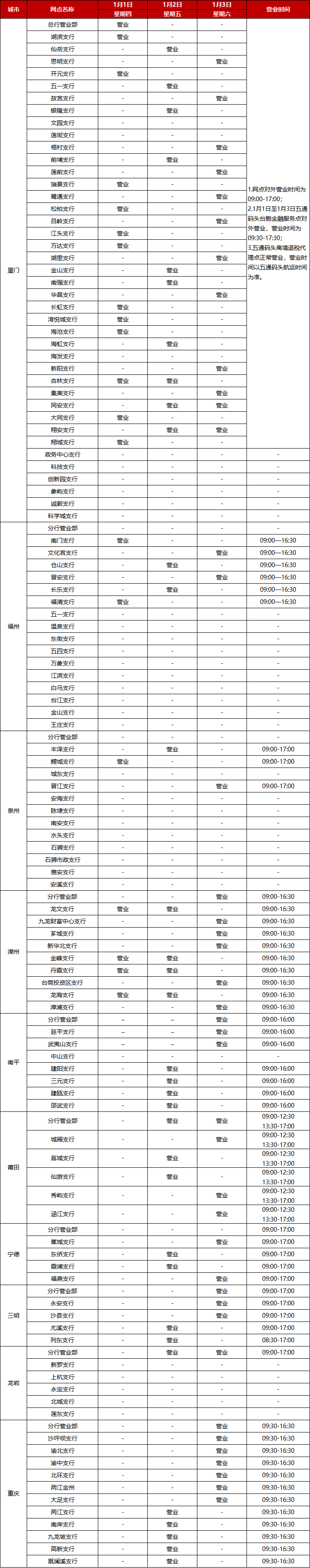 您好!根据国务院办公厅有关通知安排,2026年元旦放假时间为2026年1月1日(星期四)至2026年1月3日(星期六),共3天。现就2026元旦放假期间营业网点安排事项通知如下: