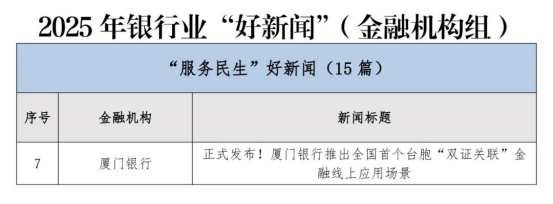 近日,在中国银行业协会组织开展的“2025年银行业好新闻”评选活动中,厦门银行新闻作品《正式发布!厦门银行推出全国首个台胞“双证关联”金融线上应用场景》从全国众多金融机构中脱颖而出,成功入选2025年银行业“服务民生”好新闻!